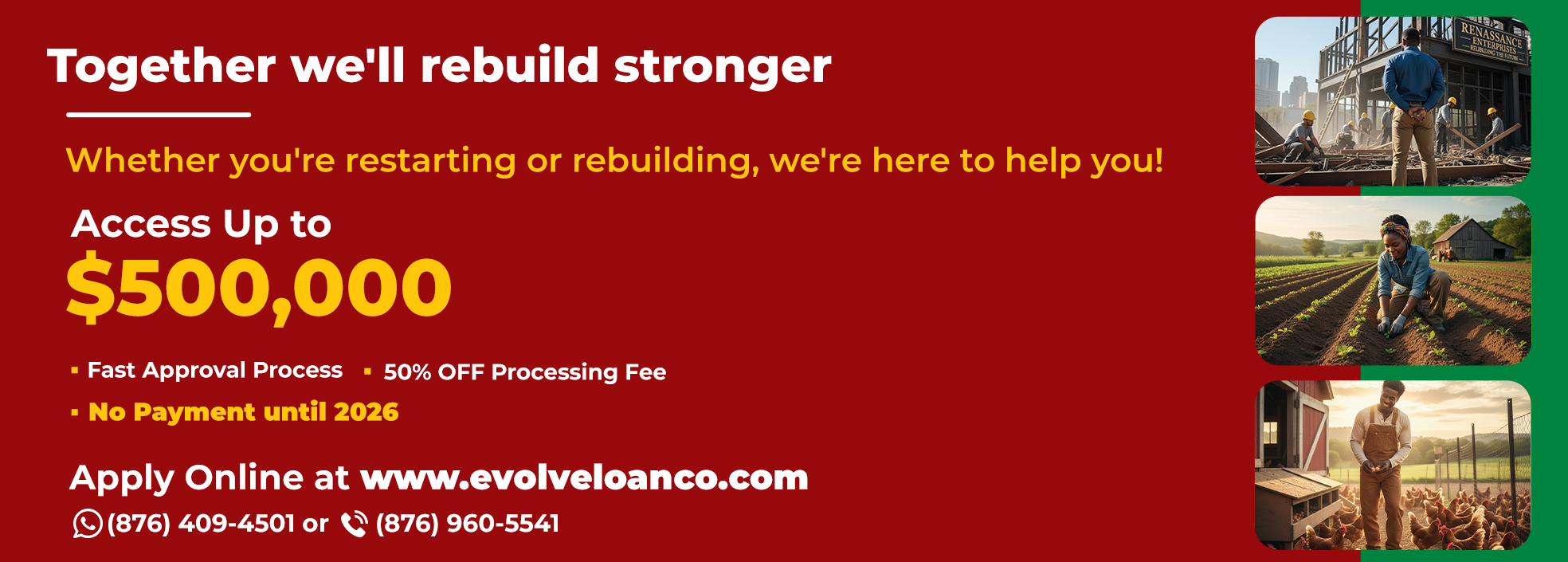 Established in 2002, Evolve Loan Co Limited (formerly McKayla Financial Services) is a micro-financing company that offers individuals, businesses, and small companies stress-free loans with competitive rates. It has grown to include seven (7) branches in St Ann’s Bay, Mandeville, Portmore, Junction St. Elizabeth, Constant Spring Road, and the Head Office located at 7 Lismore Avenue in Kingston.